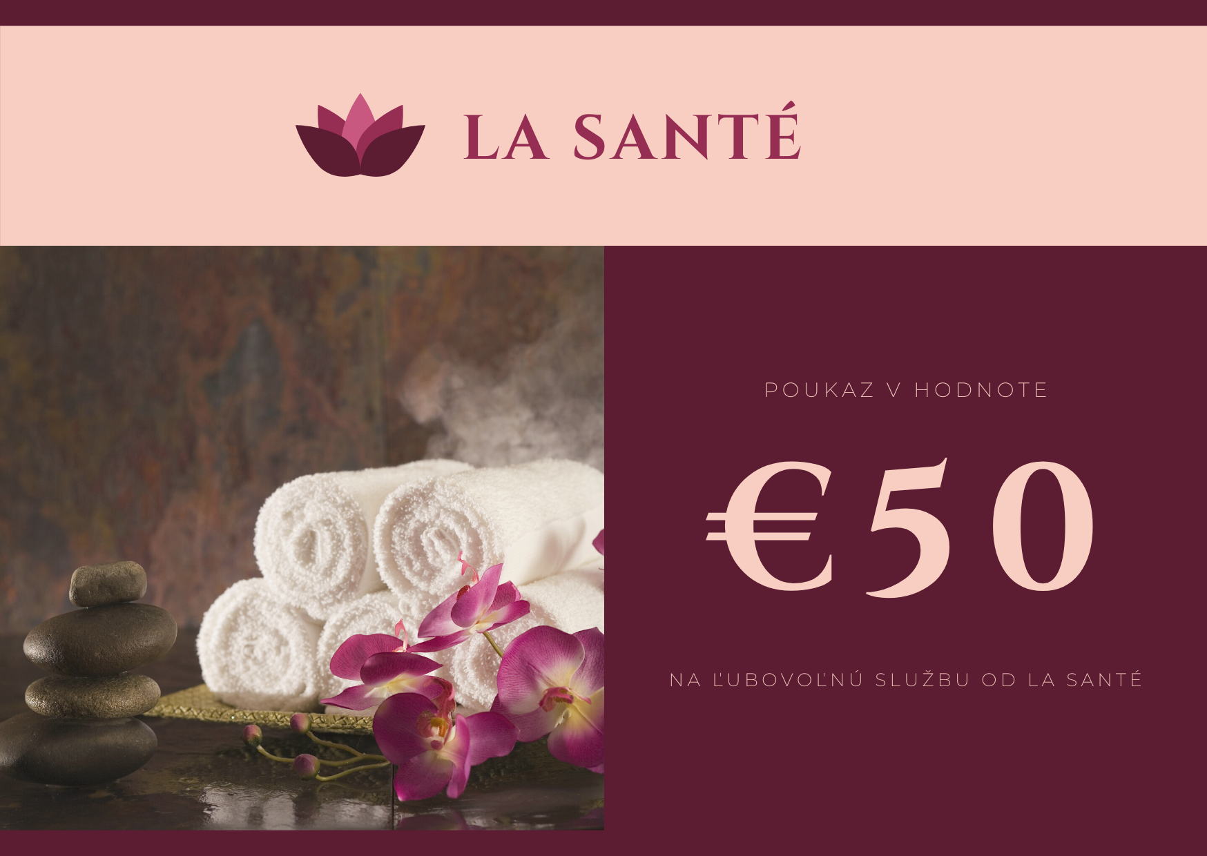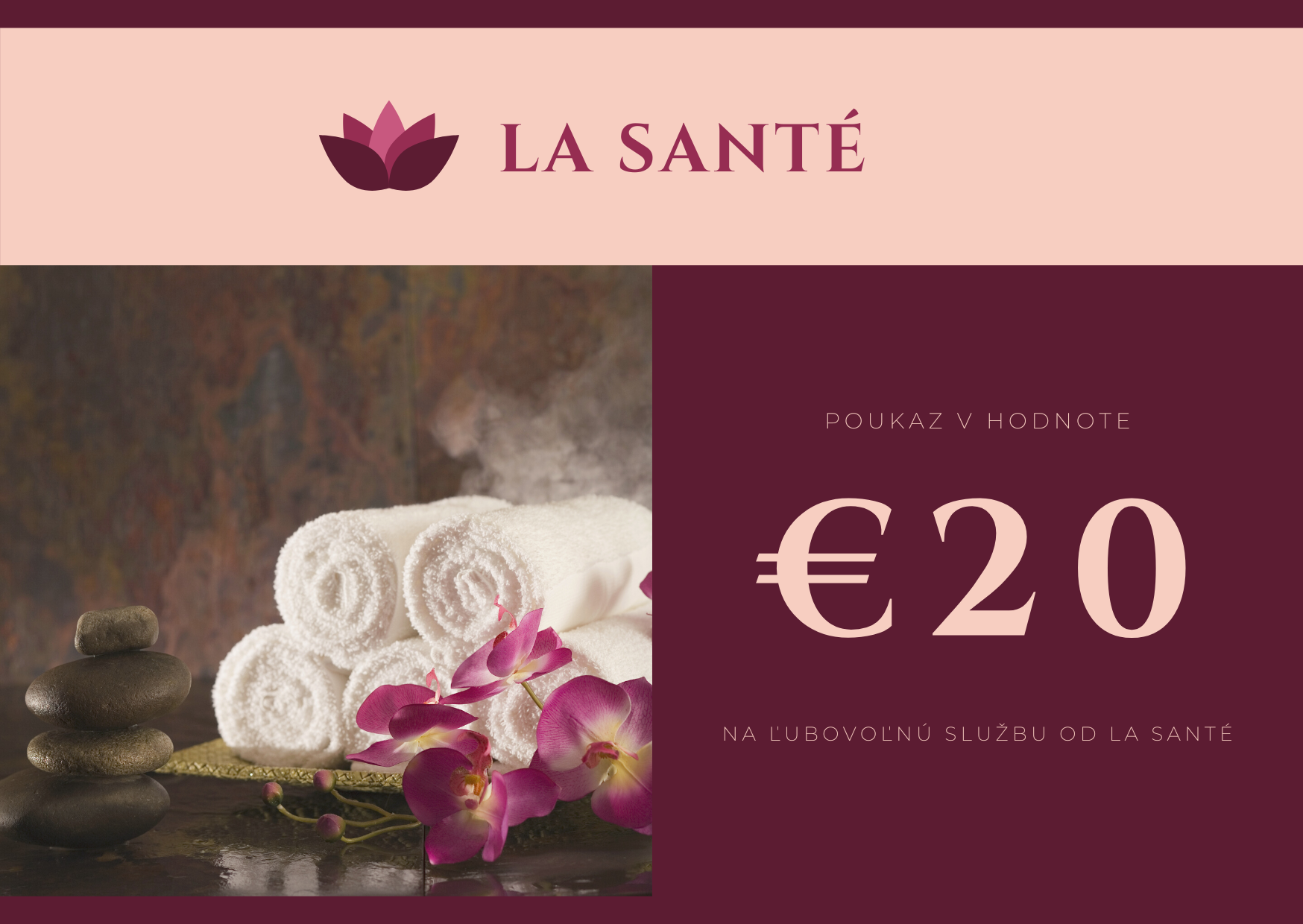 Darčeková poukážka La Santé je ideálnym darčekom pre každého, kto si chce dopriať relax a profesionálnu starostlivosť o telo. Poukážku je možné využiť na všetky masážne služby z ponuky La Santé.